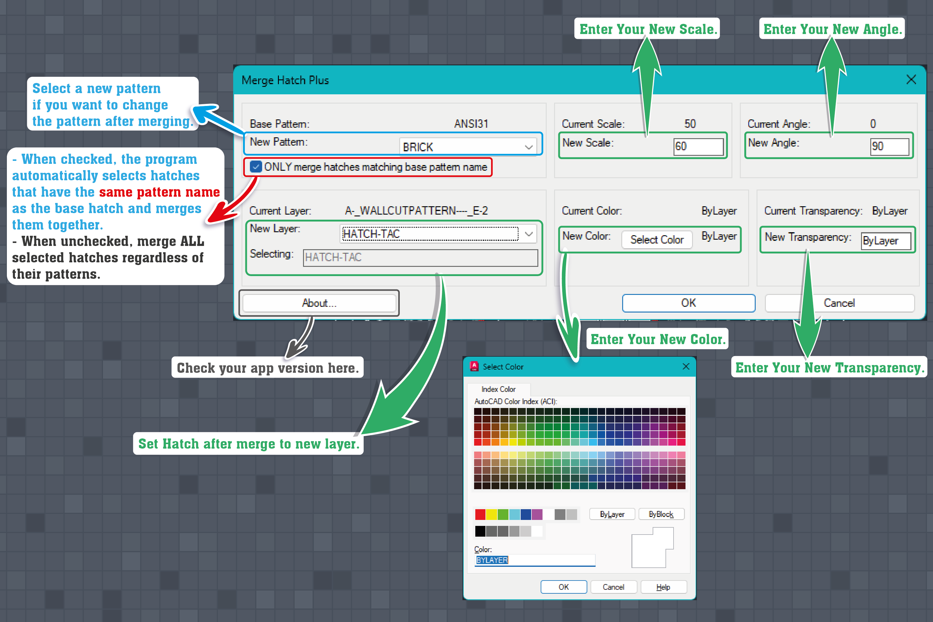- Intelligent auto-selection of hatches with the same pattern as the base hatch.