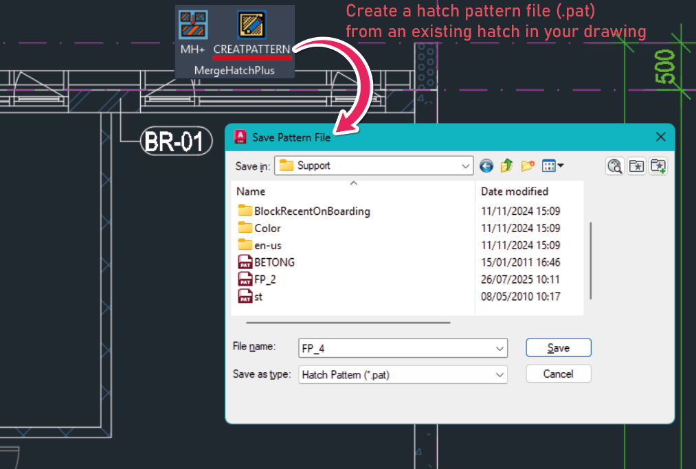 This command allows you to generate a hatch pattern file (.pat) from an existing hatch in your drawing. Simply select a hatch, and the command will extract its pattern definition, making it easy to standardize, reuse the pattern in other drawings or share it with colleagues.