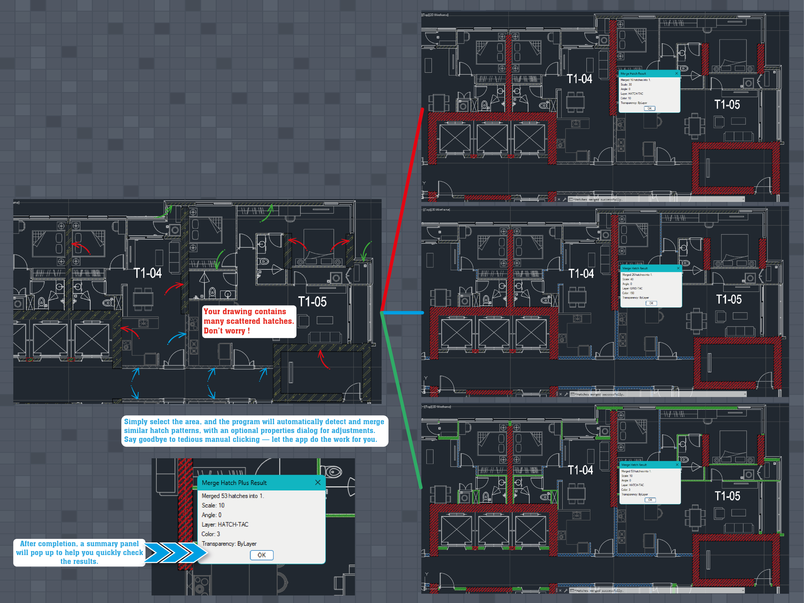 This command enables you to quickly merge multiple hatches into a single, unified hatch entity. With an intuitive dialog box, you can adjust key properties such as pattern, scale, angle, layer, color, and transparency for the merged hatch. The smart auto-selection option allows the app to automatically detect and select all hatches matching the base pattern—eliminating the need for tedious manual picking. The dialog also remembers your last used settings, streamlining repetitive tasks.